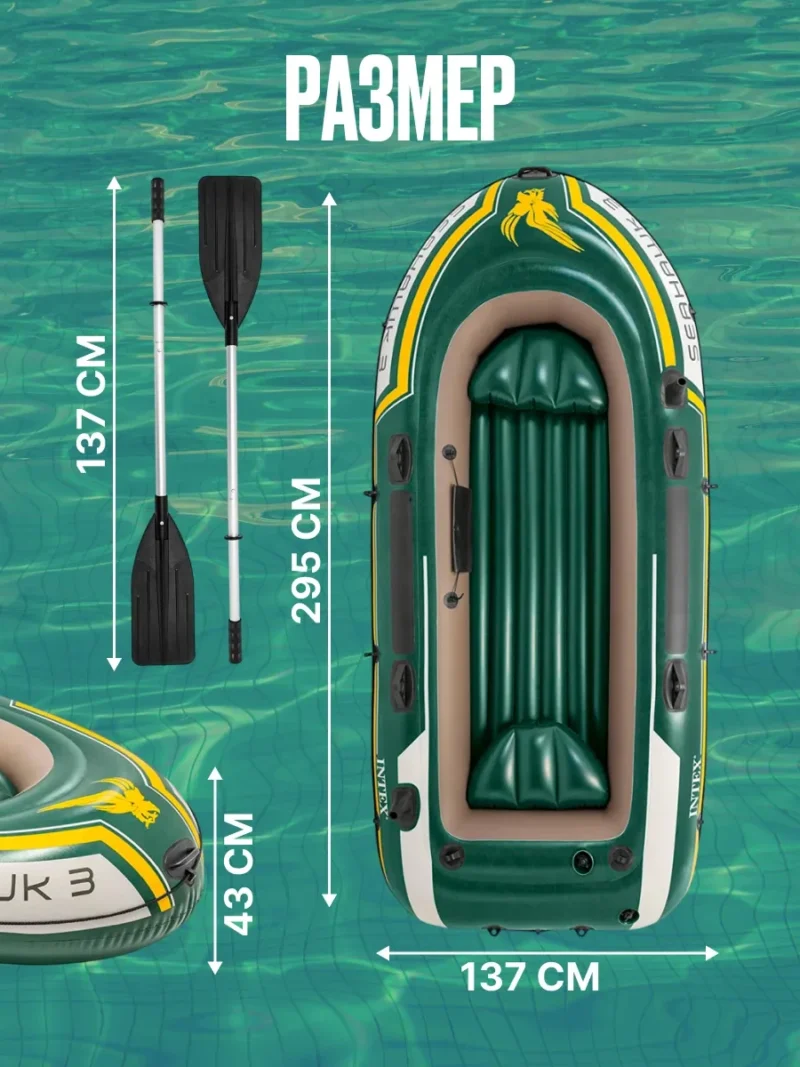 Barca gonflabilă Seahawk 3 este potrivită pentru pescarii amatori. Este format din trei camere de aer: două principale și una de rezervă. Barca este fabricată din PVC durabil folosind tehnologia Super-Tough, care nu se deteriorează din cauza apei sărate sau a expunerii la lumina soarelui. Are un maner confortabil pe prova, o franghie pentru acostarea pe toata circumferinta, doua scaune gonflabile si suporturi pentru conectarea motorului. Setul include, de asemenea, două vâsle din aluminiu (122 cm fiecare) și o pompă de mână. Dimensiuni 295x137x43 cm.