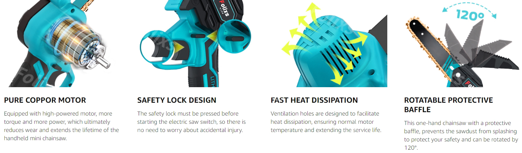 Mini ferastrau Folixs echipat cu motor din cupru pur, care nu numai ca are putere puternica si viteza mare, dar si cu sistem de protectie, traieste mai mult si mai sigur.